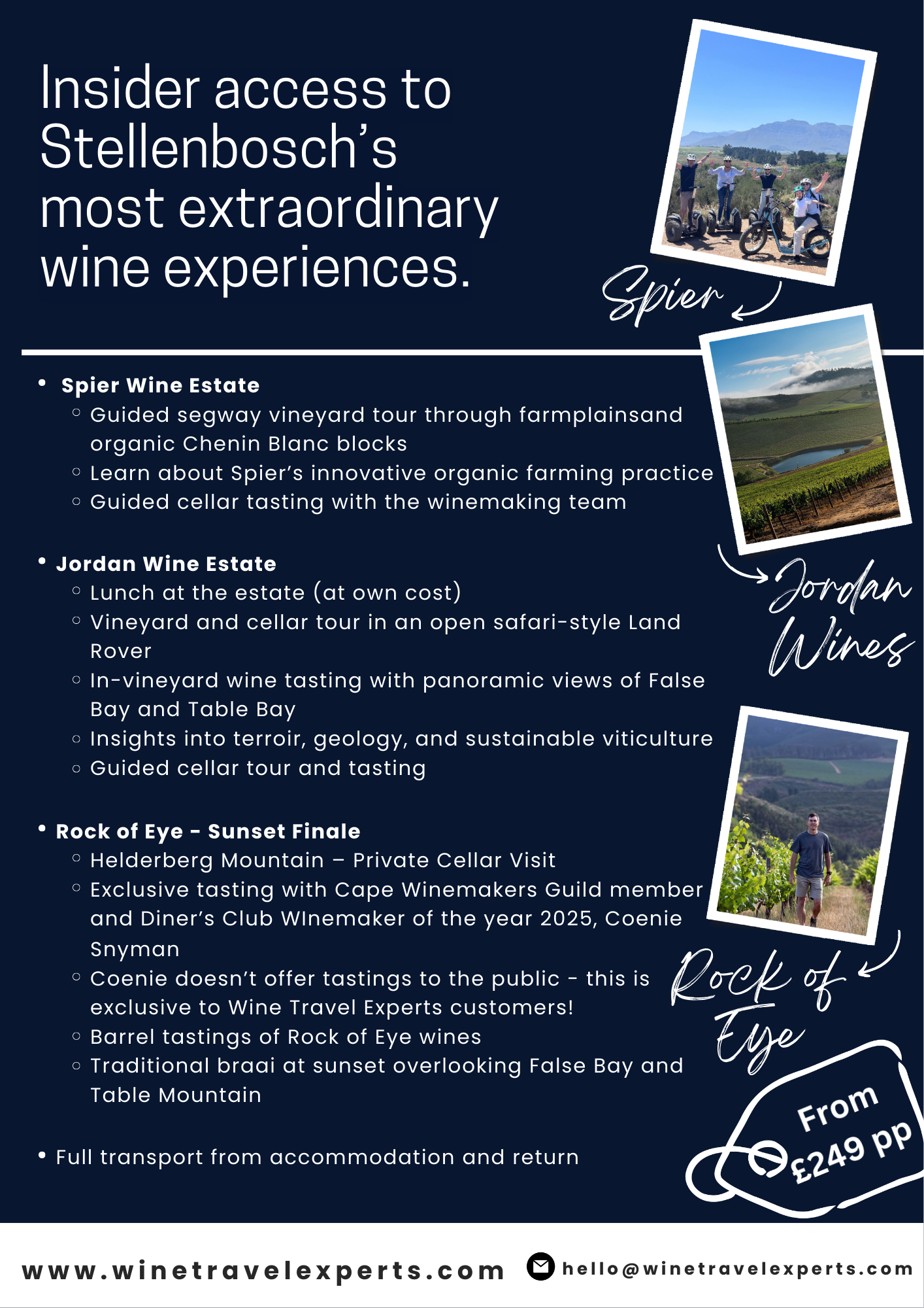 Wine Travel Experts South Africa have got the inside track on where to head to for the most memorable and exclusive wine tasting opportunities. Let us craft you visits that go beyond the glass, allowing you to experience the wineries in ways you wouldn't expect.